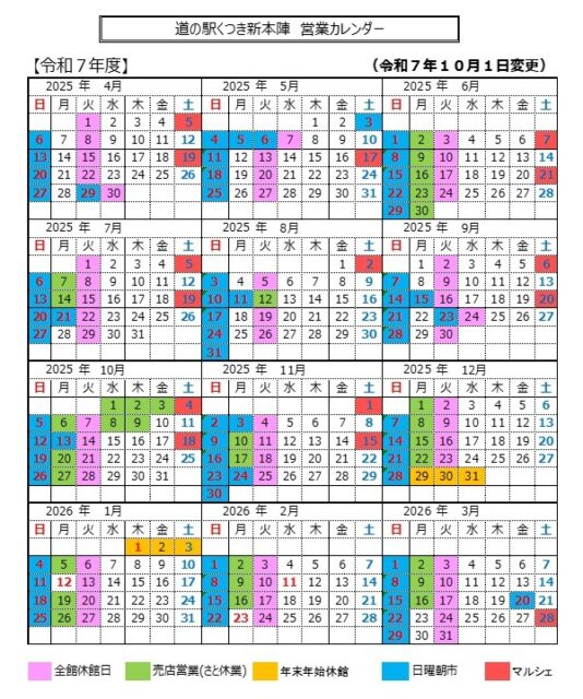 令和7年度 道の駅朽木新本陣 営業カレンダー 投稿日 2025年1月26日 更新日 2025年10月23日 著者 shinhonjin カテゴリー くつき新本陣 たくさんの方のご来店をお待ちしております。 (ご注意)「レストランさと」は10月10日からバイキング形式から定食形式、また休業日を月曜日と火曜日に変更させていただいておりますのでよろしくお願いいたします。 この記事を書いた人 shinhonjin 記事一覧